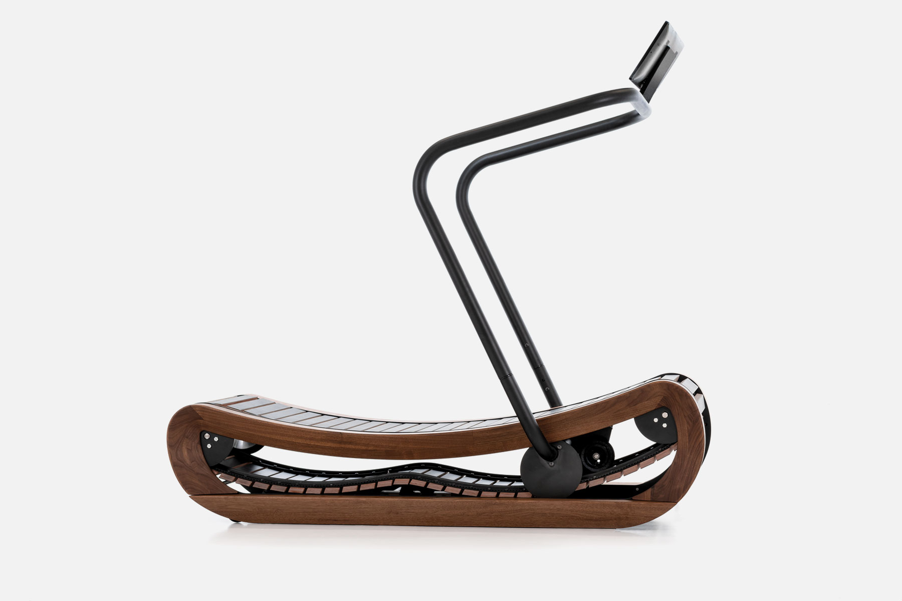 Geschwungenes, leichtes Design mit edlem Holzrahmen und Lamellenflauffläche. Die gekurvte Lauffläche fördert die Mittel- und Vorderfußlauftechnik.